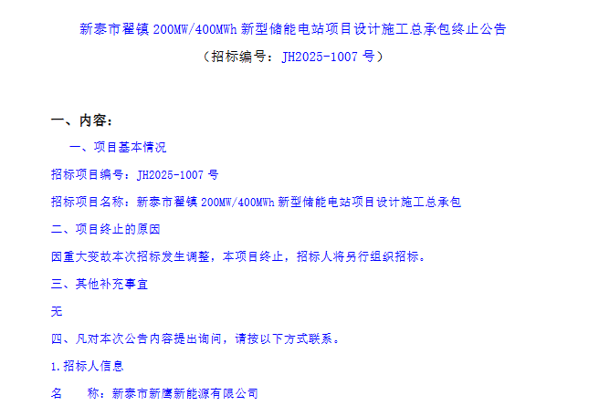 北极星储能网获悉,1月20日,山东新泰市翟镇200MW/400MWh新型储能电站项目设计施工总承包发布终止公告,公告显示,项目终止原因为重大变故,招标人将另行组织招标。据公告,该项目招标人为新泰市新鹰新能源有限公司。