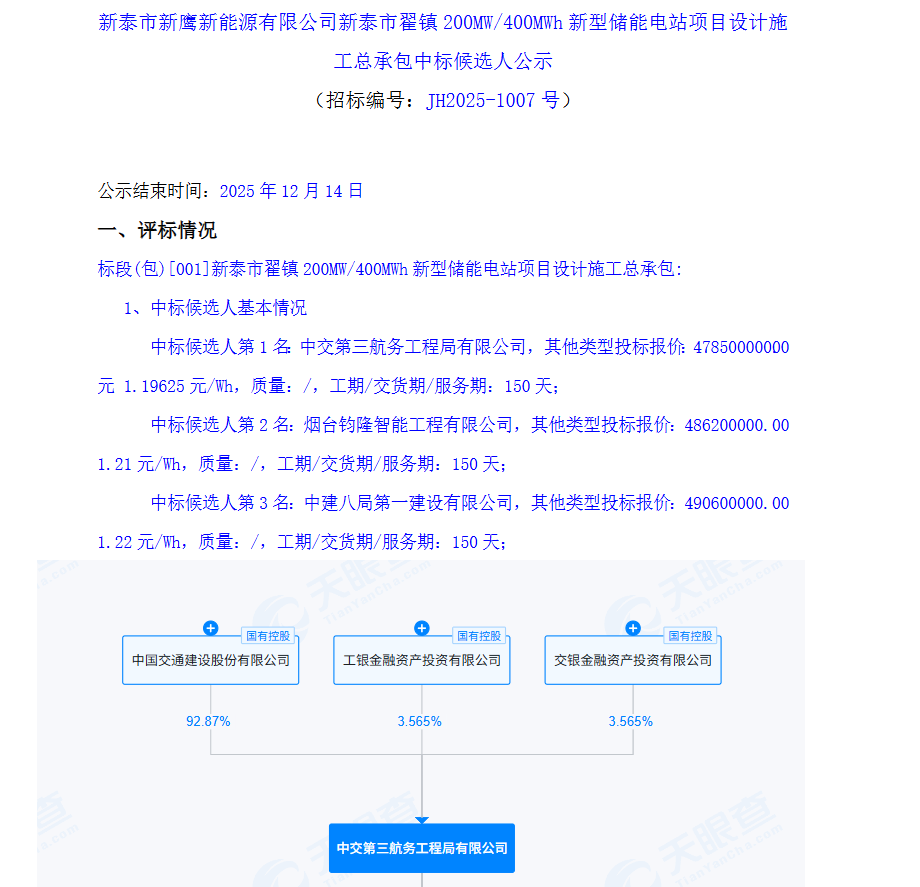 后2025年12月15日公布了中标结果,中标人为中交第三航务工程局有限公司,含联合体青岛银辰投资发展有限公司、烟建集团有限公司、济南睿能电力设计咨询有限公司,中标单价1.19625元/Wh。其中牵头方中交第三航务工程局有限公司为中国交建旗下的国有控股公司。