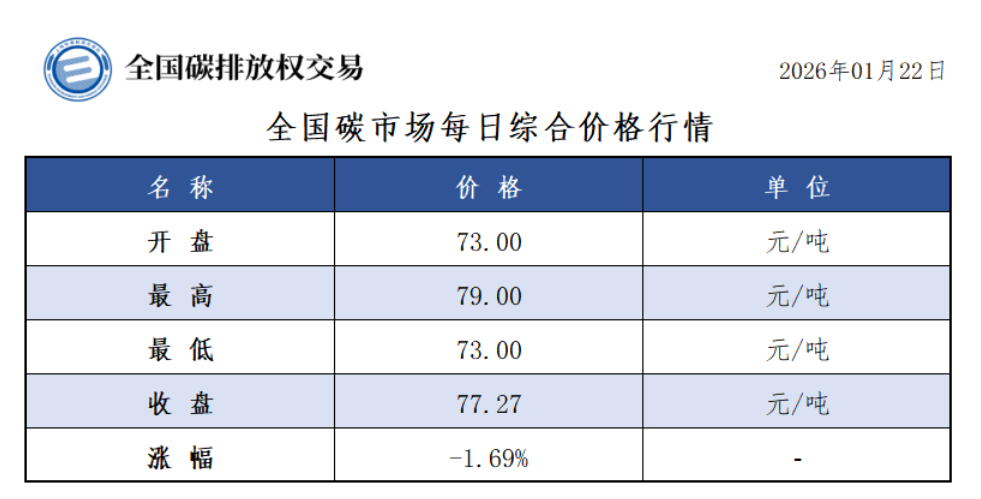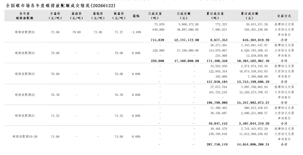 2026年1月1日至1月22日,全国碳市场碳排放配额成交量9,614,627吨,成交额690,422,652.20元。
