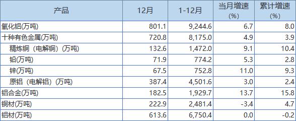 中国12月十种有色金属产量为720.8万吨,同比增加4.9%。1-12月累计产量为8,175.0万吨,同比增长3.9%。