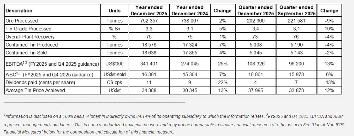 加拿大阿尔法明资源公司(Alphamin Resources)近日公布,截至12月31日的2025财年锡产量为18,576吨,基本符合调整后的产量指引(18,000-18,500吨),同比增长7%。本财年总体加工回收率为75%。2025财年锡产量受到2025年3月因安全问题暂时停止运营以及2025年4月15日分阶段重启的负面影响。