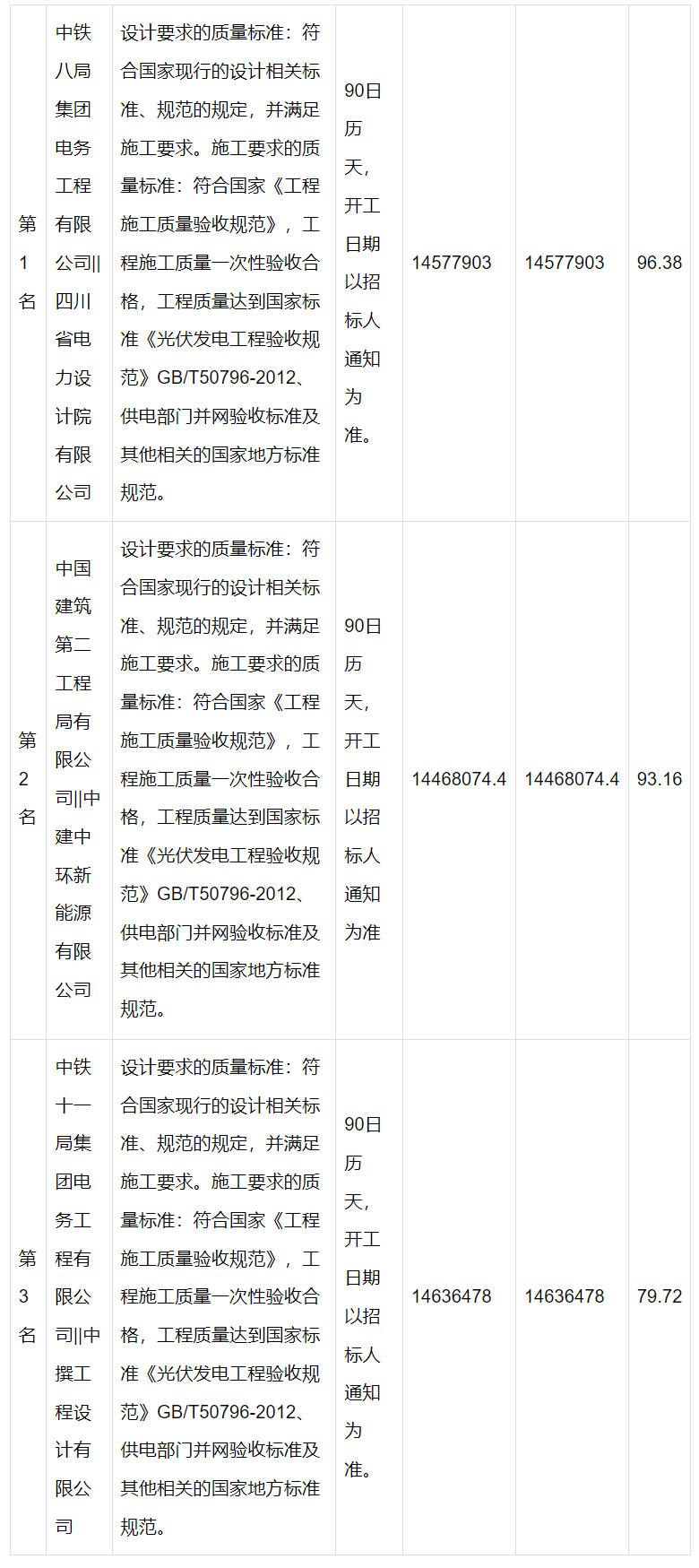 评标结果显示,中铁八局集团电务工程有限公司与四川省电力设计院有限公司组成的联合体以1457.79万元报价拟中标(约合0.729元/Wh),中国建筑第二工程局有限公司与中建中环新能源有限公司联合体、中铁十一局集团电务工程有限公司与中撰工程设计有限公司联合体分别以1446.81万元、1463.65万元报价位列第二、第三(分别约合0.723元/Wh、0.732元/Wh)。