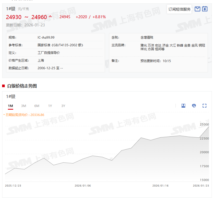 现货市场方面:1月23日,SMM1#白银上午出厂参考均价为24945元/千克,均价较前一交易日涨2020元/千克,涨幅为8.81%。据了解,,国内现货市场升水较前一交易日变化不大,上海地区大厂银锭持货商对TD升水120-130元/千克报价,国标银锭持货商对TD升水100-120元/千克或对沪期银2604合约升水130元/千克报价刚需成交。深圳市场出现看涨惜售心理,持货商出货意向偏低,小幅上调升水惜售观望,深圳投资需求略有回升,但银价大幅走高后白银投资热度不及元旦节前。现货市场高升水报价成交相对困难,上海地区少数持货商畏高或因保证金压力等原因抛售,对TD升水小幅下调至80-100元/千克,下游再度观望,现货市场成交有所转淡。
