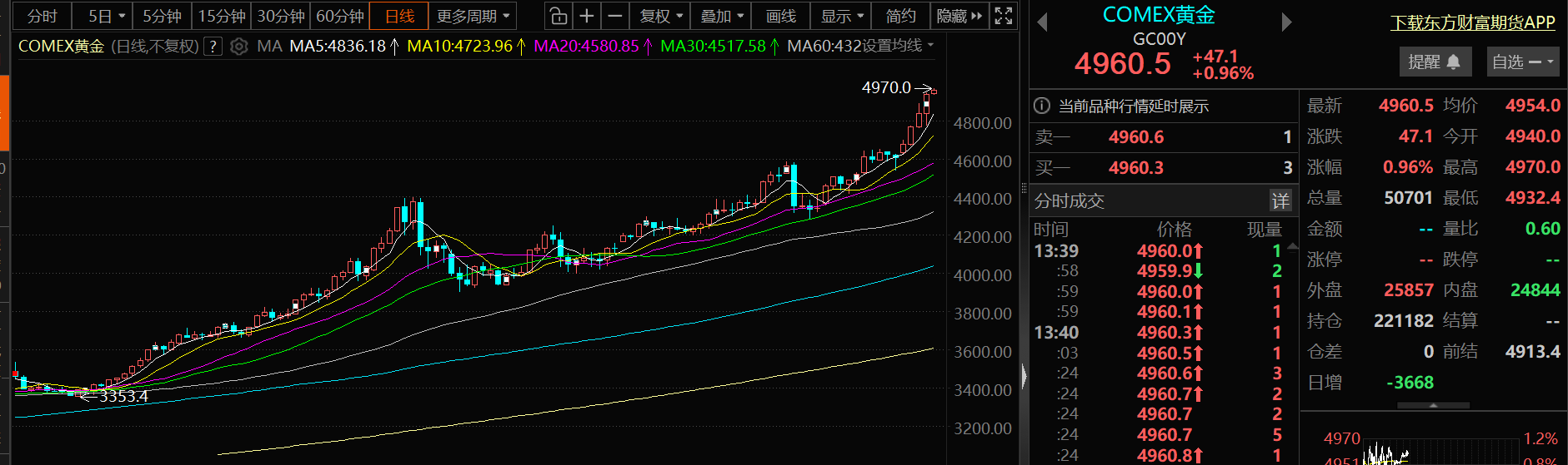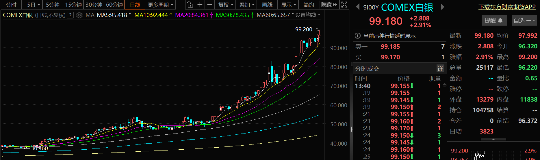据央视新闻报道,当地时间1月22日,美国总统特朗普在空军一号发表讲话时称,其政府正密切关注伊朗局势;针对对伊 “二级关税” 问题,特朗普明确表示,美国将对所有与伊朗开展贸易往来的国家加征 25% 关税,且该措施即将正式生效。伊朗相关地缘政治风险再度升温,市场避险情绪显著抬升,成为贵金属板块走强的重要支撑因素。宏观层面,美国10-11月消费者支出延续稳健增长态势,助力美国经济有望连续第三个季度保持强劲运行,但劳动力市场仍处于 “低招聘、低解雇” 的温和状态。受此影响,美元指数1月22日下行至两周多以来低点;市场对美联储货币政策的预期保持稳定,仍预计美联储将在 2026 年下半年实施两次 25 个基点的降息操作。同时,部分机构与央行层面的多重利好持续催化贵金属行情,高盛等主流投行大幅上调黄金目标价至 5400 美元 / 盎司,全球央行购金潮亦持续延续,中国央行已连续 14 个月增持黄金,波兰等国也相继公布黄金增持计划,为贵金属价格上行筑牢基本面支撑。价格走势方面,海内外贵金属均刷新历史新高,截至1月23日13:50分左右,COMEX黄金涨0.96%,盘中刷新历史新高至4970美元/盎司;沪金主连涨2.84%,盘中刷新历史新高至1119.12元/克;COMEX白银涨2.85%,盘中刷新历史新高至99.395美元/盎司;沪银主连涨8.71%,盘中刷新历史新高至25050元/千克;白银T+D涨8.63%,盘中刷新历史新高至25080元/千克。