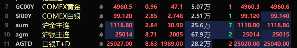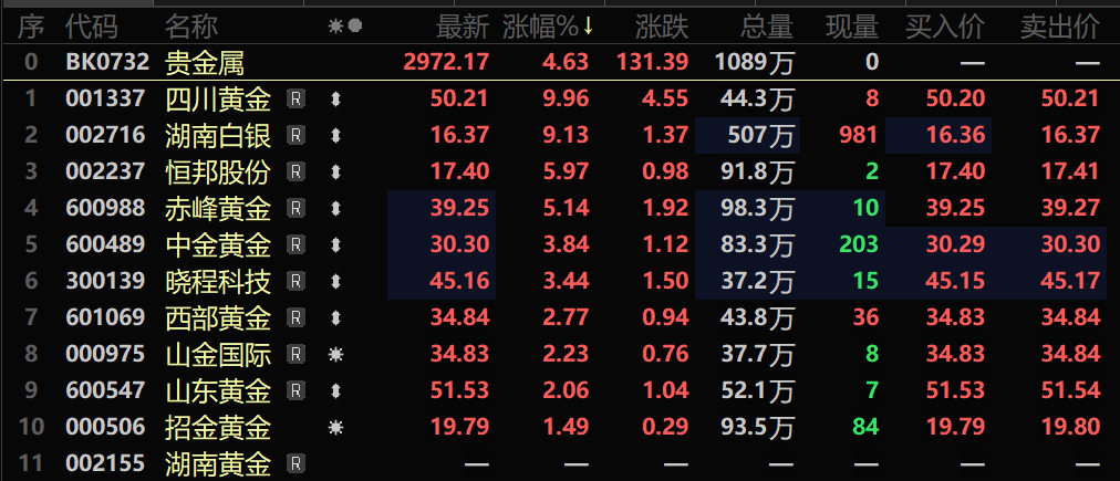 股市方面,截至1月23日14:06分,贵金属板块以4.63%的涨幅领涨所有行业,个股方面:四川黄金、湖南白银涨超9%。恒邦股份、赤峰黄金以及中金黄金等涨幅居前。