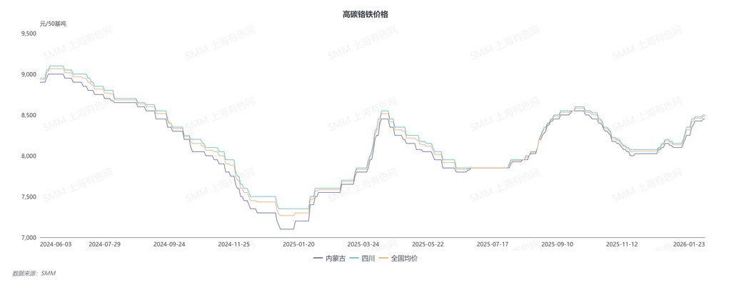 1月20日,青山、太钢公布2026年2月高碳铬铁钢招价格分别为8245元/50基吨、8045元/50基吨,环比1月份上调50元,基本符合市场前期看涨预期,铬铁价格得到支撑,内蒙古高碳铬铁报价维持8400-8500元/50基吨。