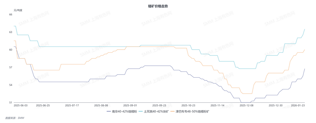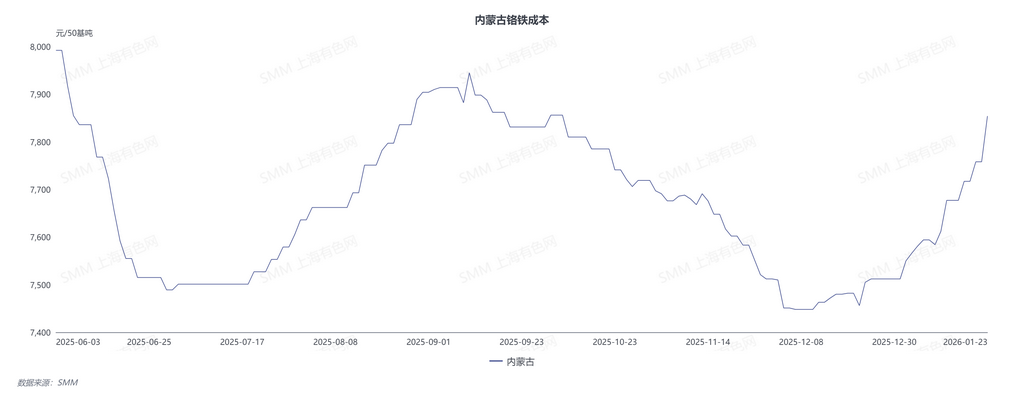 圣诞假期结束之后,南非粉海外主力矿山报盘三轮连涨,自263美元/吨大幅上调至287美元/吨,强劲支撑铬矿现货市场。国内铬矿港口库存总量下滑,供应端压力缓解,叠加铬铁厂冬储备库需求支撑,贸易商挺价情绪浓厚。主流块货源紧缺,报价涨幅明显,当前土耳其块矿报价62-63元/吨度;津巴粉因出口新政与发运受限影响成本上移,现货报价上调至59-60元/吨度;南非粉矿到港高价期货带动下报价上涨至56-57.5元/吨度。原料铬矿价格持续上涨,直接带动铬铁生产成本上移。当前内蒙古地区铬铁冶炼平均成本达7850-7920元/50基吨,支撑铬铁价格稳中向好。