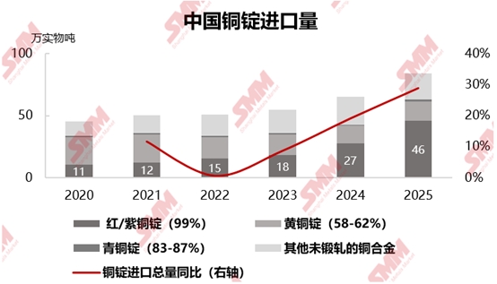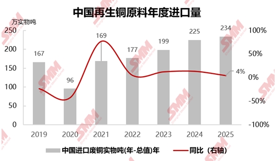据SMM统计,2025年,中国再生铜原料进口量达234.27万实物吨,同比增长4.1%,铜锭进口中,紫铜锭进口量尤为突出,达45.9万实物吨,同比增长67.6%。在国内电解铜产能扩张、铜精矿供应持续紧张的背景下,再生铜原料已成为冶炼端不可或缺的原料补充。由于国内供应增量有限,无论是铜加工端还是冶炼端,均对海外原料存在刚性需求。