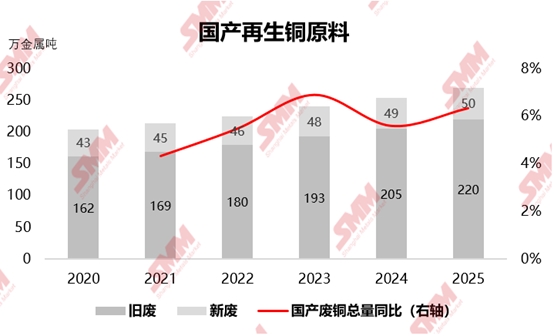 国内供应方面,在“家电补贴”、“汽车以旧换新”等政策刺激以及铜价高企的推动下,大量报废品加速进入回收体系。2025年,国内旧废产量达220.2万金属吨,新废产量为50.08万金属吨,国内回收量实现稳步增长,国产再生铜原料合计270万金属吨,同比增长6%。
