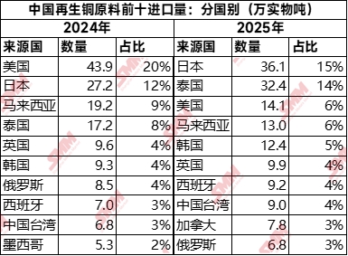 从再生铜原料进口来源看,2025年较2024年格局发生显著变化。日本超越美国成为中国最大的再生铜原料进口来源国,进口量达36.13万实物吨。泰国的进口量也超越马来西亚,达到32.43万实物吨。反观马来西亚,因其海关自2025年起实施了空前严格的再生铜原料进口新规,尤其加大了对固体废物及带皮电线电缆的打击力度,导致其本土拆解与冶炼业务萎缩,大量产业转移至泰国,中国自马进口量同比下降32%至12.96万实物吨。美国方面,受2025年5月后中美贸易摩擦升级影响,中国对美商品加征10%进口关税,迫使众多贸易商放弃美国市场直采,转而开拓东南亚及日韩货源。