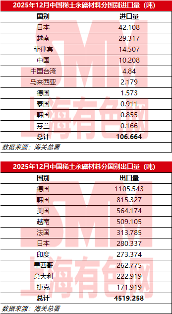 2025年12月中国稀土永磁材料分国别进出口量
