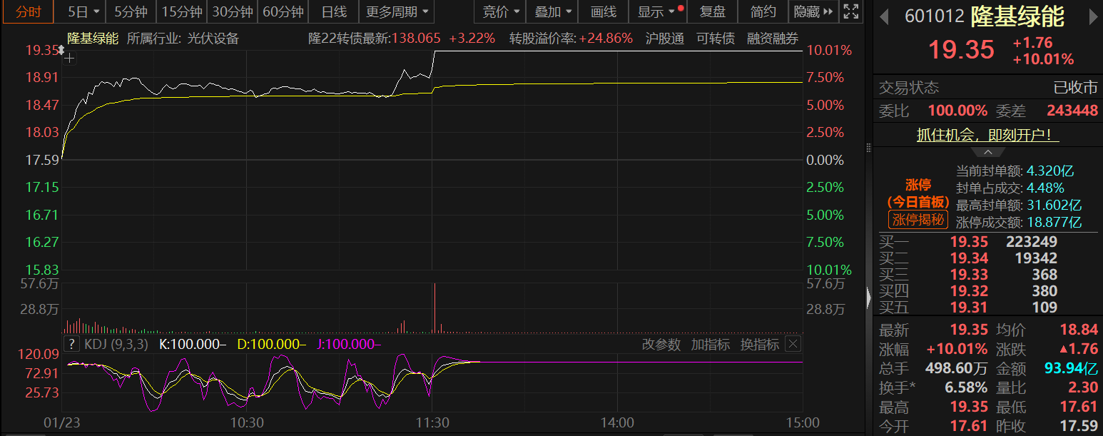 截至日间收盘,隆基绿能以10.01%的涨幅报19.35元/股。