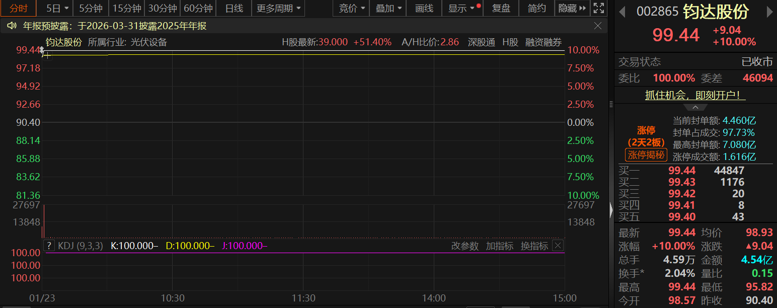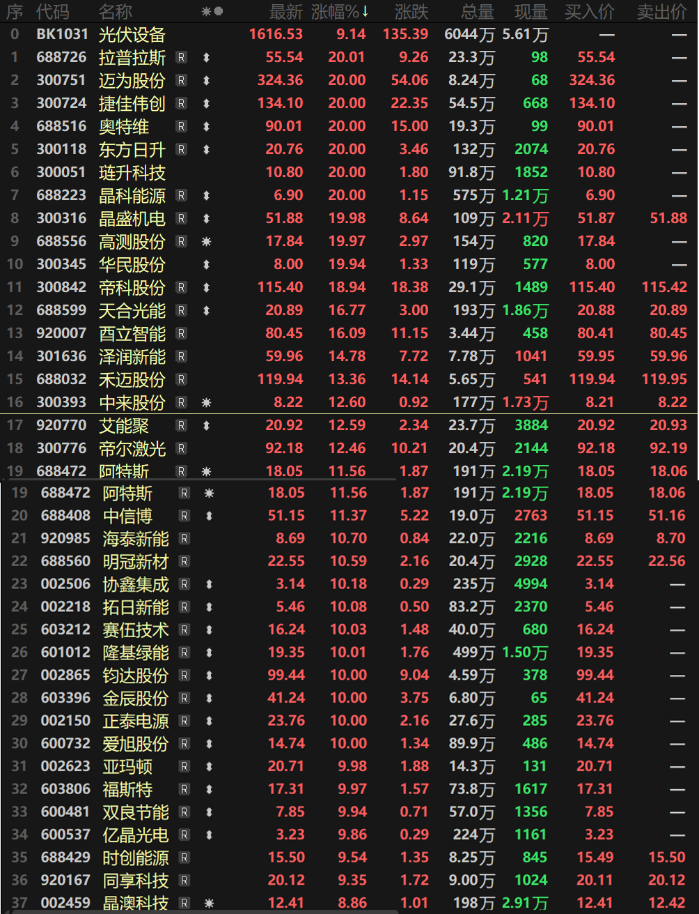 个股方面,光伏设备板块更是掀起了轰轰烈烈的“涨停潮”!拉普拉斯、迈为股份、捷佳伟创、奥特维、东方日升、琏升科技、晶科能源等7股20CM拉升涨停,晶盛机电、高测股份、华民股份等多股涨逾10%,协鑫集成、拓日新能、隆基绿能、钧达股份、双良节能、爱旭股份等近14股一同封死涨停板。