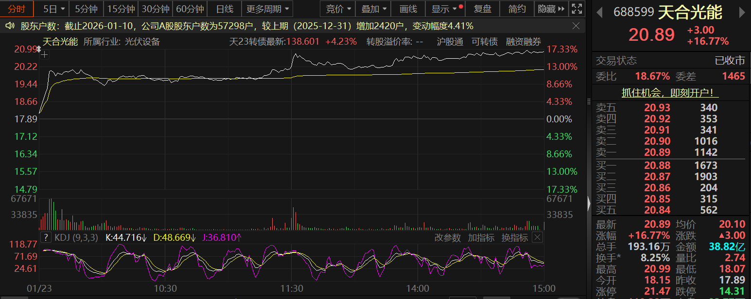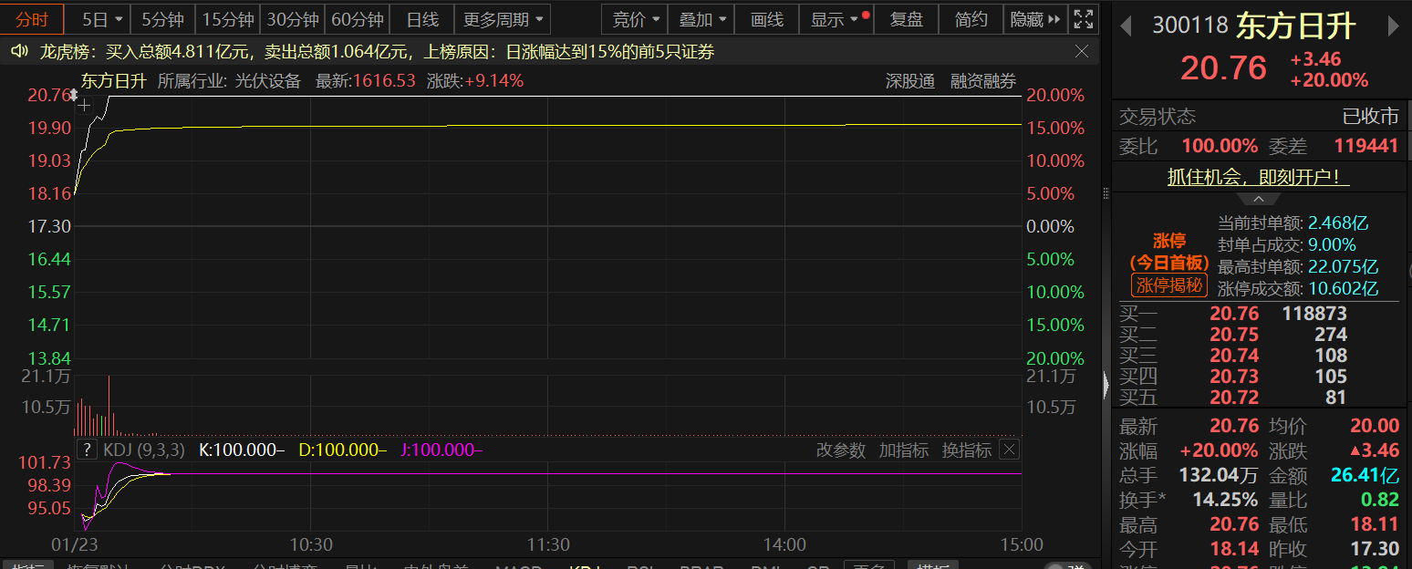 截至日间收盘,东方日升以20%的涨幅报20.76元/股。