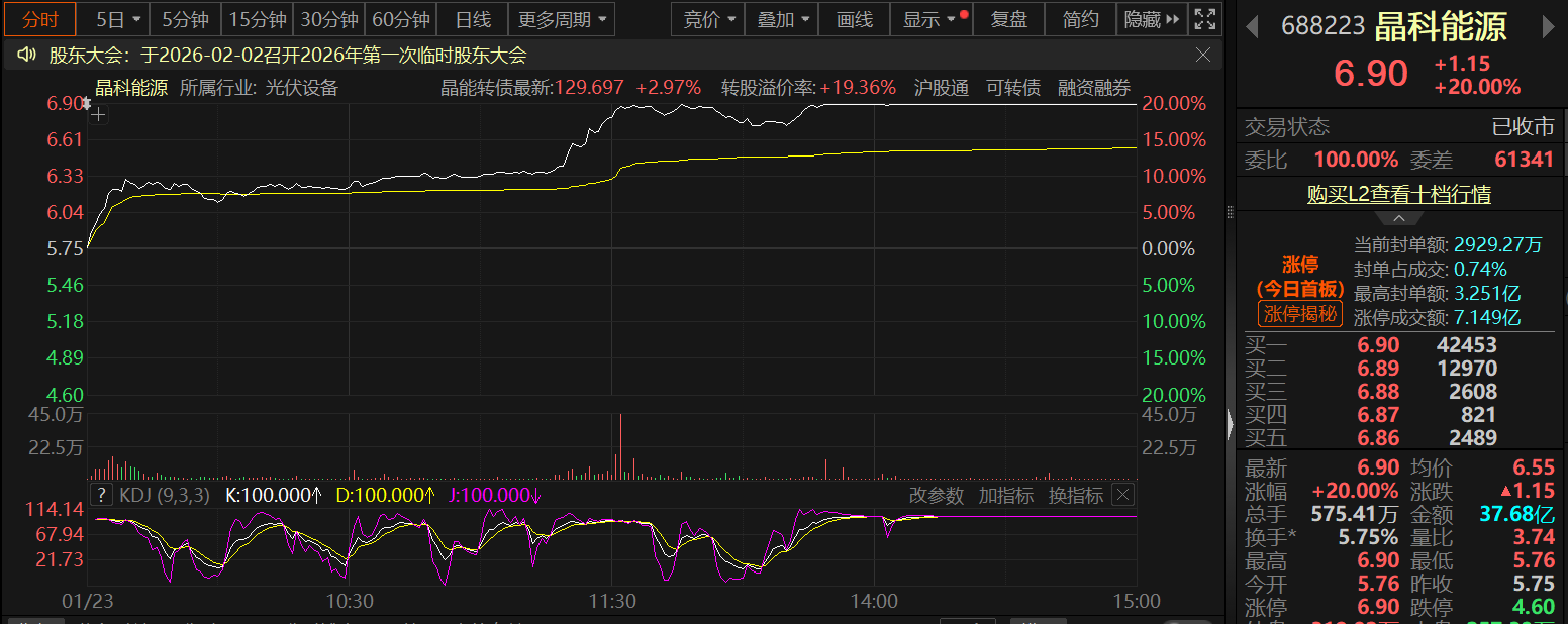 截至日间收盘,晶科能源以20%的涨幅报6.9元/股。