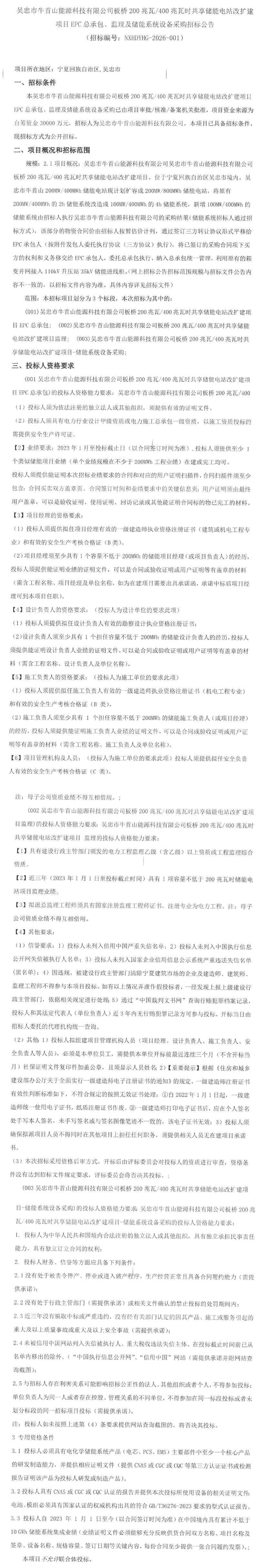 新增的100MW/400MWh的储能系统由招标人执行吴忠市牛首山能源科技有限公司的采购结果。