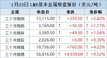 伦敦时间1月23日17:00(北京时间1月24日01:00),LME三个月期铜上涨359.5美元,或2.82%,收报每吨13,115.0美元。盘中触及一周高点13,182美元。该金属在1月14日创下13,407美元的历史新高。