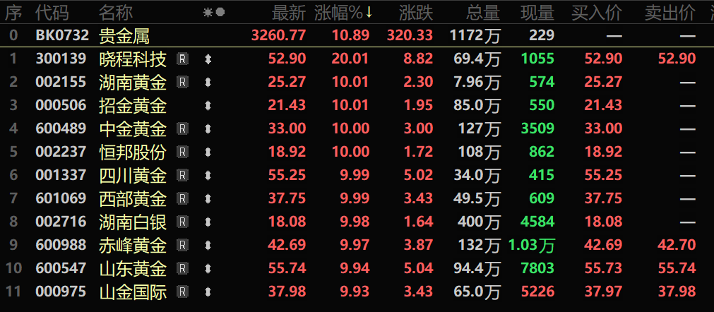 股市方面,截至1月26日收盘,贵金属板块以10.89%的涨幅领涨所有行业,个股方面:晓程科技以20%的涨幅涨停,湖南黄金、中金黄金、恒邦股份以及招金黄金等多股涨停。