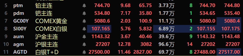 特朗普日前威胁对加拿大加征 100% 关税,这一表态引发市场对全球贸易格局波动的担忧;同时中东伊朗地区地缘局势持续紧张,进一步推升市场避险情绪;叠加美元指数1月26日走弱,盘中曾一度跌至自2025年以来的低点至96.94;以及多国央行持续增持黄金、全球白银储备布局从零星持有转向战略规划,且部分市场人士预计后续或将有更多国家提升白银储备规模等多重因素共振,推动贵金属期股联袂暴涨!截至1月26日15:17分左右,COMEX黄金涨2.03%,盘中刷新历史新高至5107.9美元/盎司;沪金主连涨3.67%,盘中刷新历史新高至1151.7元/克;COMEX白银涨5.76%,盘中刷新历史新高至109.955美元/盎司;沪银主连涨12.78%,盘中刷新历史新高至28226元/千克;白银T+D涨11.46%,盘中刷新历史新高至27766元/千克。