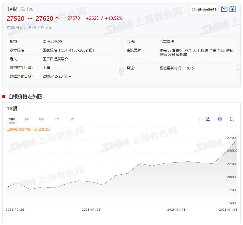 现货市场方面:1月26日,SMM1#白银上午出厂参考均价为27570元/千克,均价较前一交易日涨2625元/千克,涨幅为10.52%。据了解,随着银价的大幅上涨,国内现货市场出现惜售,上海地区大厂银锭持货商对TD升水250-300元/千克报价,个别持货商对TD升水300-350元/千克挺价惜售。深圳市场报价差异较大,市场流通货源仍偏紧张,持货商对TD升水200-300元/千克报价,深圳市场投资需求在银价大幅上涨行情中再度燃起,临近春节,部分料商仍有意向积极备库。广东地区冶炼厂厂提货源对沪期银2604合约升水200-250元/千克少量成交,下游工业刚需积极议价,但据SMM了解硝酸银开工已出现下滑,日内现货市场成交以投资需求为主,银物料加工企业普遍观望,现货市场成交整体偏淡。