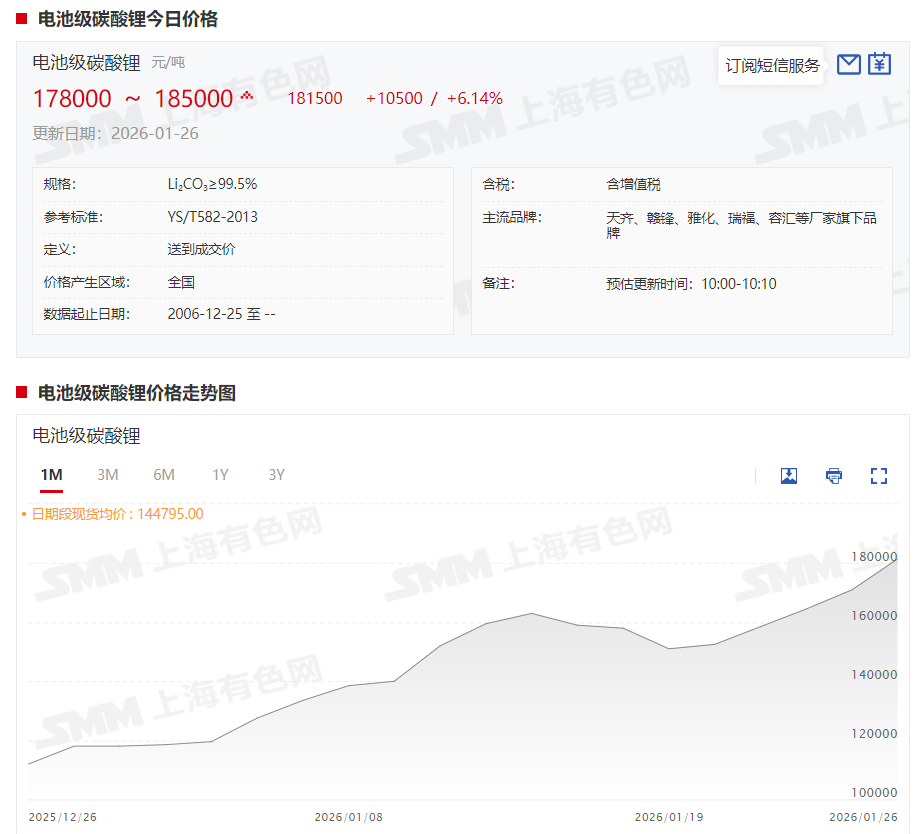 SMM 1月26日讯:自1月20日以来,碳酸锂现货价格整体呈现上涨态势,据SMM现货报价显示,1月26日,电池级碳酸锂现货报价单日上涨1.05万元/吨,均价已经成功突破18万元/吨的整数关口。截至1月26日,电池级碳酸锂现货报价涨至17.8~18.5万元/吨,均价报18.15万元/吨,较1月19日低点的15.1万元/吨上涨3.05万元,涨幅达20.2%。