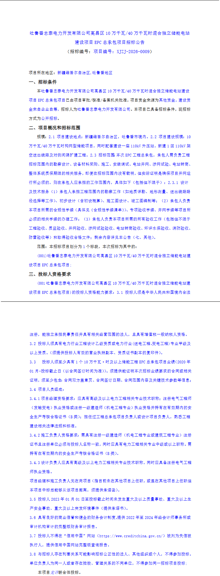 1月23日,吐鲁番志泰电力开发有限公司发布高昌区10万千瓦/40万千瓦时混合独立储能电站建设项目EPC总承包招标公告,项目落地于新疆维吾尔自治区吐鲁番地区。