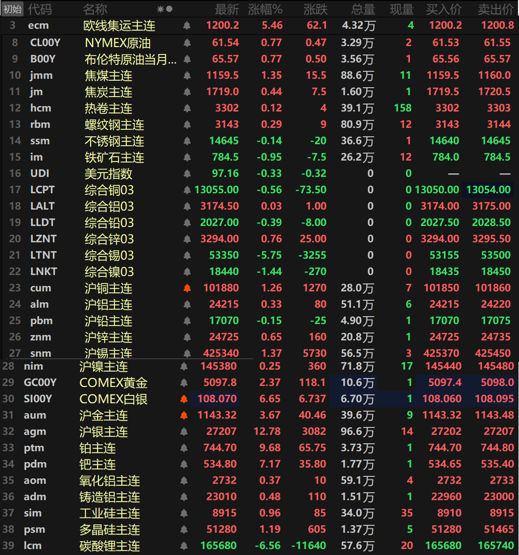 贵金属方面,截至15:04分,COMEX黄金涨2.37%,其盘中最高冲至5107.9美元/盎司,继续刷新其上市以来的历史新高;COMEX白银涨6.65%,盘中最高冲至109.32美元/盎司;国内方面,沪金涨3.67%,盘中最高冲至1151.7元/克,继续刷新其上市以来的历史新高;沪银涨12.78%,盘中最高攀升至28226元/千克,一同刷新其上市以来的新记录!