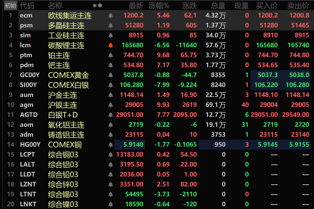 隔夜贵金属方面:COMEX黄金涨0.5%,盘中一度刷新历史新高至5107.9美元/盎司后出现回落,最终涨幅收窄;COMEX白银涨2.52%,盘中一度刷新历史新高至117.7美元/盎司。隔夜沪金涨1.49%,盘中刷新历史新高至1154.46元/克;沪银涨9.93%,盘中刷新历史新高至30020元/千克。