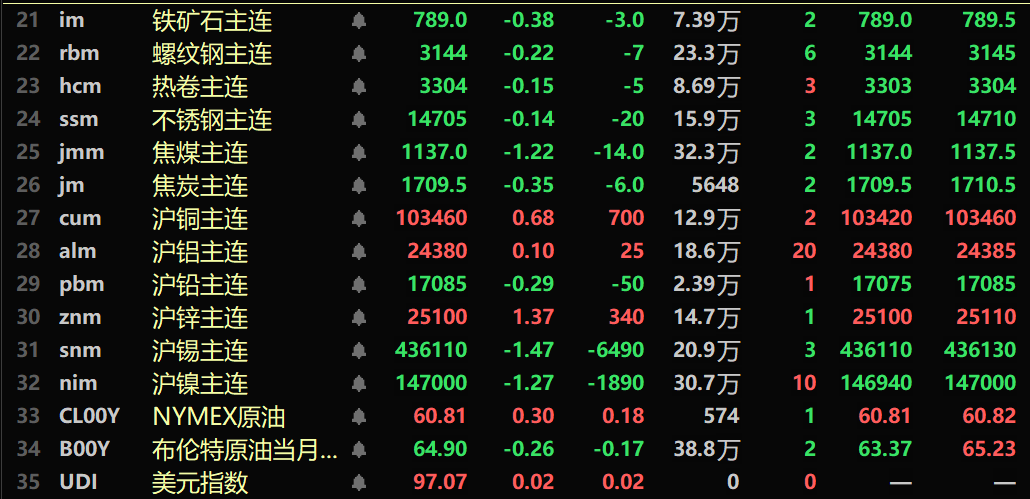 隔夜黑色系均飘绿,铁矿跌0.38%,不锈钢跌0.14%,螺纹钢跌0.22%,热卷跌0.15%。双焦方面:焦煤跌1.22%,焦炭跌0.35%。