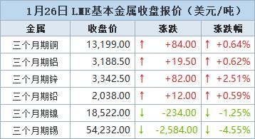 伦敦时间1月26日17:00(北京时间1月27日01:00),LME三个月期铜上涨84美元,或0.64%,收报每吨13,199.0美元,盘中曾触及13,311美元,为1月14日以来最高。