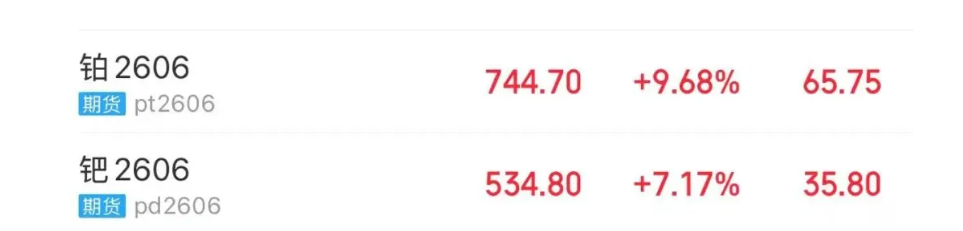 1月26日,铂族金属跟随金属板块同步大涨。截至当日收盘,铂期货主力2606合约上涨9.68%,报744.70元/克;钯期货主力2606合约大幅上涨7.17%,报534.80元/克。