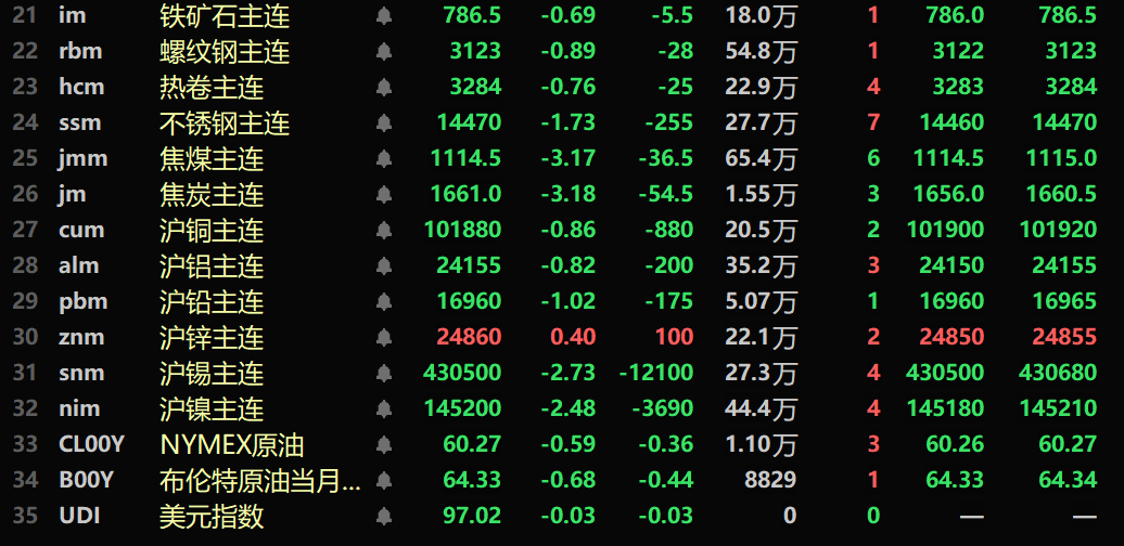 黑色系均飘绿,铁矿跌0.69%,螺纹跌0.89%,热卷跌0.76%,不锈钢跌1.73%。双焦方面:焦煤主力合约跌3.17%,焦炭主力合约跌3.18%。