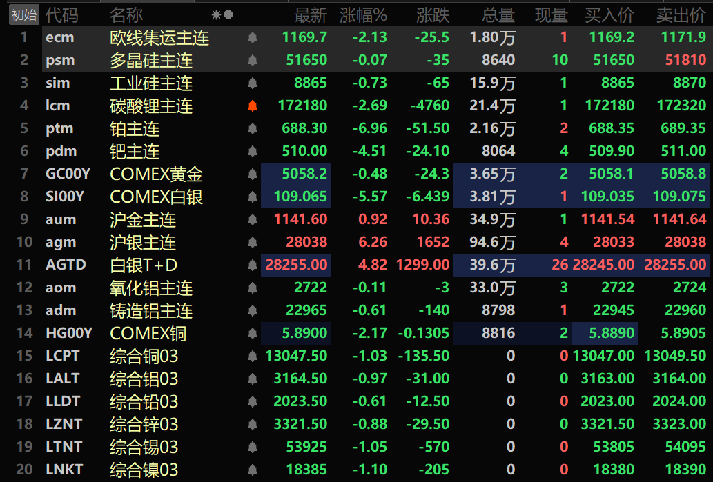 贵金属方面,截至11:39分,COMEX黄金跌0.48%;COMEX白银跌5.57%。内盘贵金属方面:沪金主连涨0.92%,盘中刷新历史新高至1154.46元/克;沪银主连涨6.26%,盘中刷新历史新高至30020元/千克。