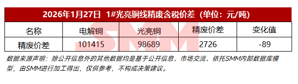 2026年1月27日1#光亮铜线精废价差【SMM数据】