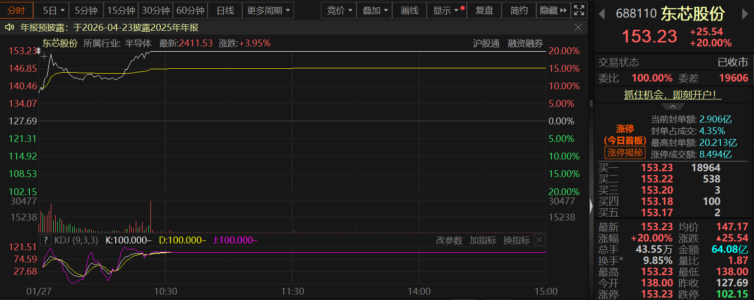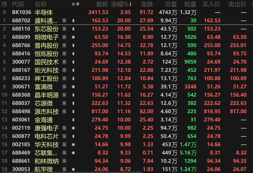 SMM 1月27日讯:1月27日午后,半导体板块指数快速拉涨,盘中一度涨逾4%。个股方面,盛科通信-U、东芯股份20CM涨停,明微电子、恒烁股份、普冉股份等多股一同涨逾10%,金海通、康强电子、电科芯片等多股一同封死涨停板!