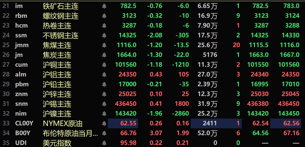 隔夜黑色系均飘绿,铁矿跌0.76%,不锈钢跌2.08%,螺纹钢跌0.32%,热卷跌0.18%。双焦方面:焦煤跌1.2%,焦炭跌1.3%。