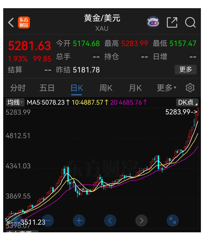 现货黄金日内大涨100美元,涨幅1.93%,最新突破5280美元/盎司。
