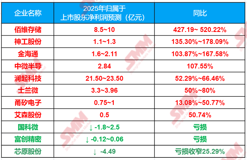 自进入2025年三季度以来,半导体及存储芯片行业发展持续向好,存储芯片行业更是掀起了一波接一波的“涨价潮”,而半导体行业的明显回暖和存储芯片的供不应求带动产业链相关业绩表现也十分出色。目前已有多家产业链企业发布2025年业绩预告,多数业绩在半导体行业向好的背景下录得不同程度的上涨,SMM整理如下: