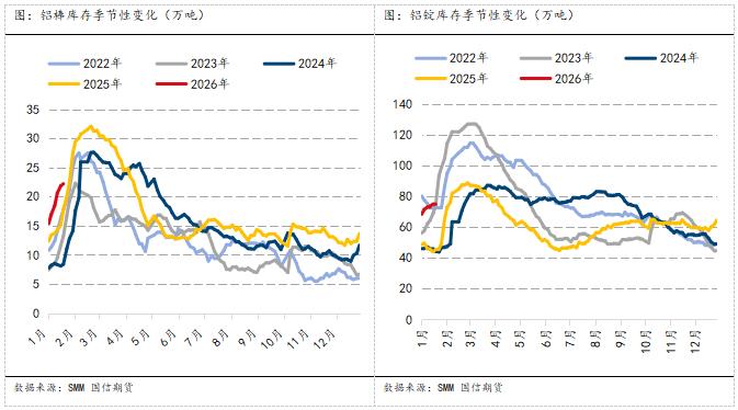 需求的疲态也逐渐在库存上有所体现。据SMM数据,截至1月26日,铝锭库存为77.7万吨,铝棒库存为23.5万吨,1月以来整体处于累库趋势之中。当前铝锭的社会库存累库拐点不仅早于往年同期,更打破了近年来库存持续低位的常态。随着节前备货带来的需求脉冲结束后,节日前后因企业停工导致的消费真空期将接踵而至。市场预期铝锭的累库压力将在2月延续,并维持同期高水平的状态,这将成为压制铝价上方空间的最直观压力。