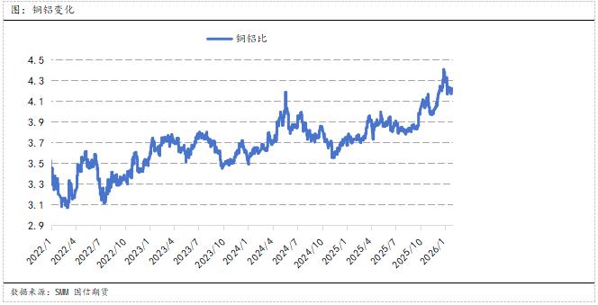 从比价关系分析,前期铜价快速上行推动国内铜铝比价显著攀升,并于2025年12月底触及4.4左右的高位。这一异常比价结构,结合市场中“以铝代铜”所带来的替代预期,为铝价打开了较大的补涨窗口。随后在地缘争端升级的催化下,铝价实现阶段性补涨。目前国内铜铝比虽已回调至4.2附近,但仍处于历史较高区间。2025年以来,铜的战略属性与金融价值进一步凸显,叠加铜精矿供应紧缺与持续增长的需求之间的结构性矛盾,共同构成了铜价长期向上的基本面逻辑。在此背景下,铜价的相对强势仍将通过比价效应与关联情绪,对铝价形成一定支撑。同时需要理性认识到的是,“以铝代铜”在终端应用中存在行业与技术层面的客观局限,其推广是一个长期的技术迭代与市场接受过程,短期内对实际需求的拉动效应可能较为有限。另一方面,与铜相比,铝的金融属性相对偏弱,且电解铝的供应约束程度不及铜矿端严峻,因此中长期而言,铝价的上行动能或弱于铜。综合来看,当前铜铝比价维持在较高水平的状态,在未来一段时期内仍可能延续。铜铝比价的异常波动将继续成为观测铝价走势的重要风向标之一,但在当前铜价强势格局下,该比价或难以快速回归至过往数年的低位水平。