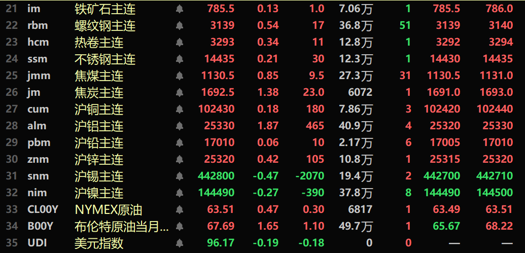 隔夜黑色系均飘红,铁矿涨0.13%,不锈钢涨0.21%,螺纹钢涨0.54%,热卷涨0.34%。双焦方面:焦煤涨0.85%,焦炭涨1.38%。