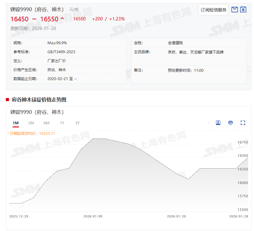 镁价偏强运行,据SMM报价显示:1月28日,镁锭9990(府谷、神木)的报价为16450~16550 元/吨,其均价为16500元/吨,较前一交易日涨1.23%。16500元/吨这一均价与SMM镁锭9990(府谷、神木)2025年12月31日的均价15750元/吨相比,上涨了750元/吨,涨幅为4.76%。