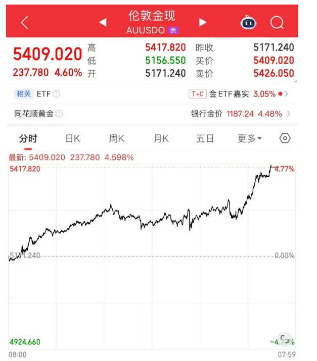 今天凌晨,国际金价再创历史新高。截至发稿,伦敦金现货价格收涨4.6%,报5409.2美元/盎司,盘中最高涨至5417.82美元/盎司。纽约期金主力合约涨逾6%。