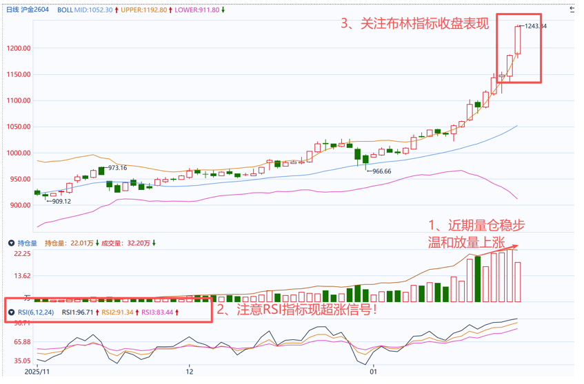 沪金主力Au2604合约延续强势拉涨,呈现五连阳,且近期上升中量仓均稳步放大,趋势状态良好,布林指标延续处于多头状态,但由于短期的快速拉涨,RSI短中长期读数均超过80,显示盘面或存在一定超涨风险。技术面看,短期沪金主力合约或有望偏强运行,需关注今日收盘量仓表现,和K线与布林轨道的位置,观察布林指标是强势延续or释放短期超涨信号。