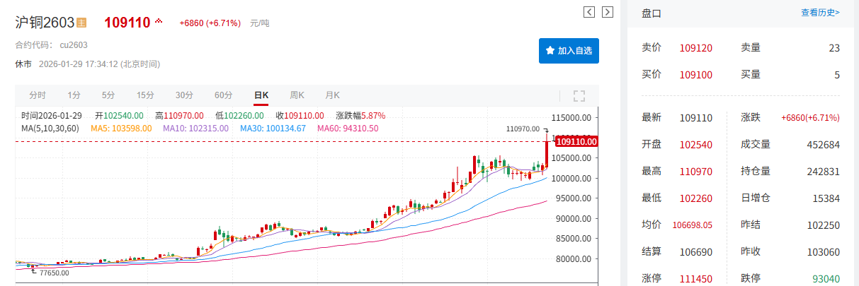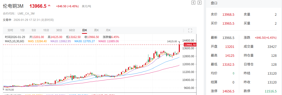 截至1月29日17:32分,伦铜涨6.45%,盘中刷新历史新高至14125美元/吨;沪铜涨6.71%,盘中刷新历史新高至110970元/吨。