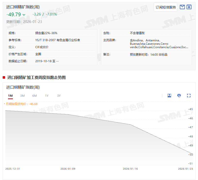 供应方面:铜矿供应偏紧局面未见缓解,SMM铜精矿指数(周)继续下滑,据SMM数据显示,1月23日SMM进口铜精矿指数(周)报-49.79美元/干吨,较上一期的-46.53美元/干吨减少3.26美元/干吨。20%品位内贸矿计价系数为95%-97%。
