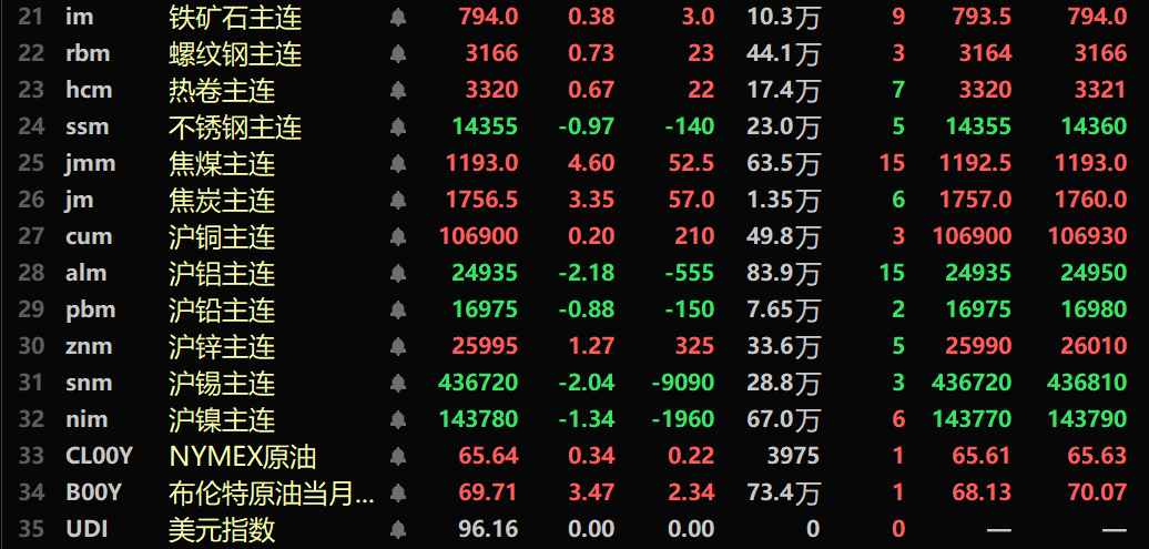 隔夜黑色系多飘红,铁矿涨0.38%,不锈钢跌0.97%,螺纹钢涨0.73%,热卷涨0.67%。双焦方面:焦煤涨4.6%,焦炭涨3.35%。