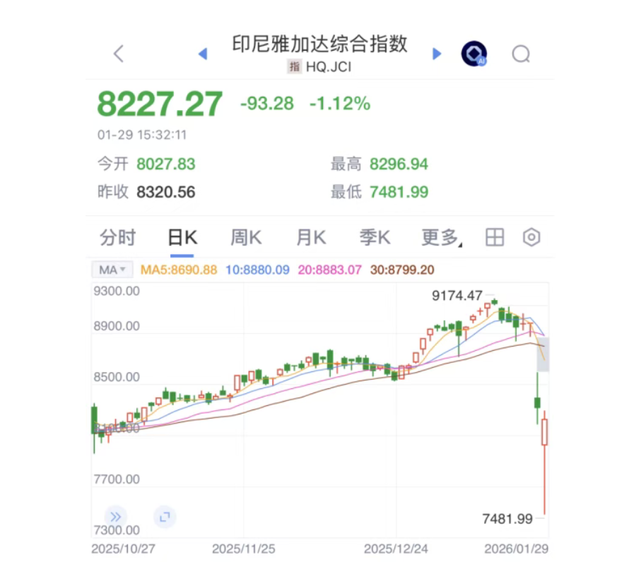 1月29日,印尼股市延续昨日的暴跌走势。印尼雅加达综合指数早盘一度下跌10.1%,至7481.99点,为2025年8月以来最低。该指数还多次触发交易暂停机制。午后,随着印尼相关部门发布积极应对信息,印尼雅加达综合指数跌幅有所收窄。