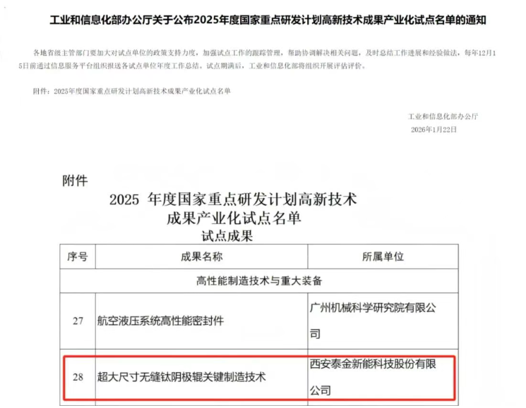 据泰金新能消息:近日,由公司牵头、河南省科学院宋克兴教授担任首席科学家的“十四五”国家重点研发计划项目“高强极薄铜箔制造成套技术及关键装备”,顺利通过项目综合绩效评价。项目核心成果“超大尺寸无缝钛阴极辊关键制造技术”,成功获批工业和信息化部办公厅2025年度国家重点研发计划高新技术成果产业化试点,标志着我国在高端铜箔制造装备领域,实现了从技术追赶到产业引领的关键性跨越。