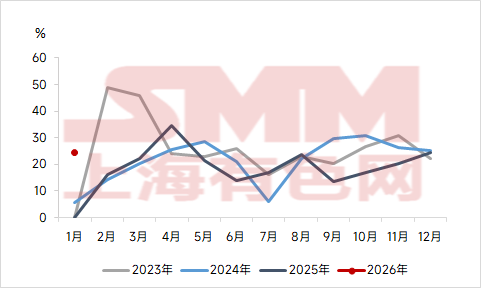 【SMM调坯开工率】据SMM调研,截止1月30日,主产建材的调坯钢厂开工率为24.49%,较12月开工率环比下降0.11%,年同比增长24.49%。